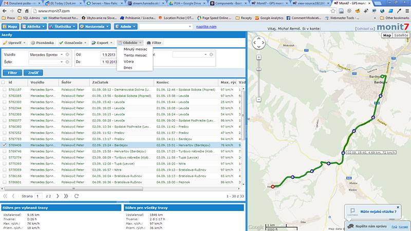 Na mape vidíte prehľad kde sa Vaše vozidlá nachádzajú, kto je šofér, akou idú rýchlosťou alebo trasu za poslednú hodinu.